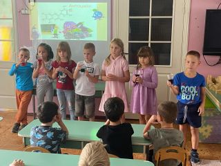 В ДУК-4 успешно продолжается сотрудничество с библиотекой. Для детей старшей и подготовительной групп проведена презентация «Удивительный мир овощей». В процессе занятия дети узнали тайны о происхождении самых популярных овощей, которые заняли достойное место на наших кухнях. Все овощи объединены по определенным признакам в разные семейства: крестоцветных, тыквенных, зонтичных. Фантастические открытия в исследовательской деятельности на примере с краснокочанной капустой убедили ребят в ее волшебных свойствах, добавляя в сок капусты питьевую соду, лимонную кислоту, уксус - менялся цвет сока. Занятие прошло интересно, интеграция разных областей обогащают детей знаниями и практическими навыками в поисково-экспериментальной деятельности.
