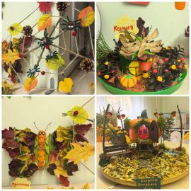 ДУК-5. Осень - чудесная пора, которая своей красотой вдохновляет на создание чего-то прекрасного! В честь долгожданной щедрой гостьи в ДУК-5 в средней группе № 8 прошла выставка поделок детского и семейного творчества из природных материалов «Осенняя феерия», в которой охотно приняли участие семьи наших воспитанников. Много интересных работ было представлено на выставке. Поделки поразили оригинальностью замысла, эстетичностью оформления, неповторимостью, яркостью и техникой выполнения. Фантазия участников не знала границ. Дети испытали положительные эмоции и с радостью делились своими впечатлениями от совместного творчества.