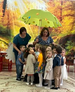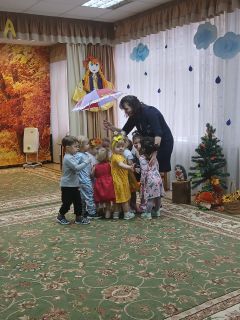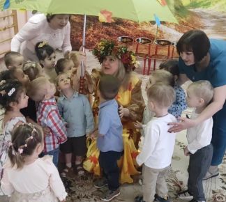 В нашем детском саду у воспитанников первой младшей группы состоялся осенний праздник. Ребята покатались на паровозике и спели песенку «Листик желтый». Красавица «Осень» услышала, что ее зовут и пришла с корзиной, в которой для малышей были подготовлены сюрпризы. Дети вместе с гостьей звонили в колокольчики, стучали ложками, прятались под зонтиком от дождя и помогли собрать осенние листочки, которые разбросал ветер. Мероприятие было веселым, ярким, увлекательным, и, конечно все мальчики и девочки получили от Осени подарки.