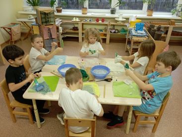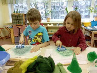 ДУК-5. Воспитанники разновозрастной группы № 6 под руководством и при помощи педагога, изготовили елочку из шерсти в технике «мокрого валяния». Шерсть – мягкий и пластичный материал, поэтому работали с ней дети с большим удовольствием. Для начала ребята выбрали понравившийся оттенок для своей елочки, затем начали вытягивать прядки шерсти из основной пасмы и выкладывать в разных направлениях на основу. Далее смочили шерсть мыльным раствором и с этого момента начался волшебство валяния. Дети мягкими движениями приглаживали шерстку, затем все сильнее увеличивали нажим. Потом массировали ее специальным приспособлением, мяли, катали, бросали и в конце искупали свое изделие в холодной и горячей воде. После того как елочки высохли, ребята украсили их красивыми бусинами. Искусство валяния развивает у детей художественный вкус, формирует сенсорное восприятие, умение творчески мыслить, помогает научиться концентрироваться, развивает координацию движений, мелкую и крупную моторику, а также воображение и интуицию. Занятие прошло очень весело, а главное дети приобрели новый опыт и замечательное украшение для новогоднего стола.
